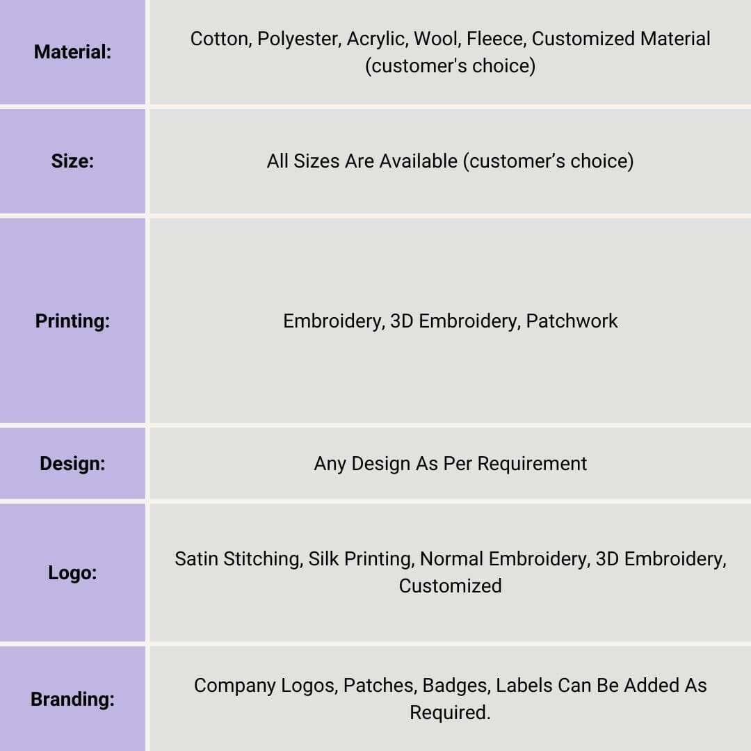 | Material | Cotton, Polyester, Acrylic, Wool, Fleece, Customized Material (customer’s choice) |