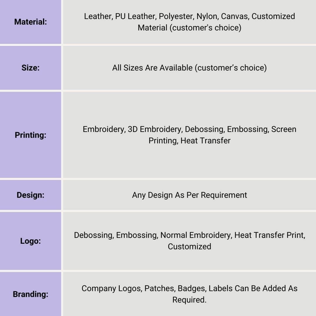 | Printing | Embroidery, 3D Embroidery, Debossing, Embossing, Screen Printing, Heat Transfer |
