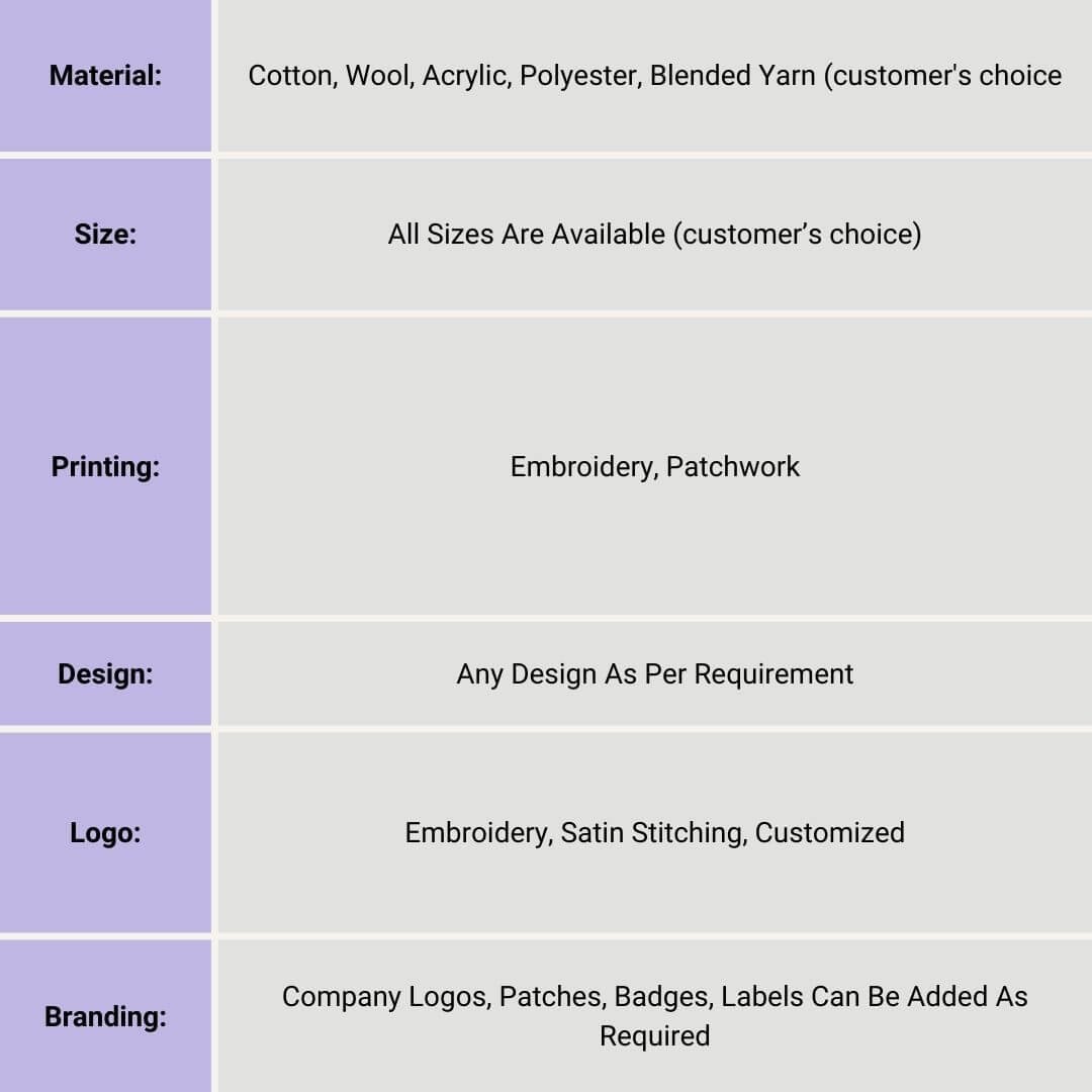 | Material | Cotton, Wool, Acrylic, Polyester, Blended Yarn (customer’s choice) |