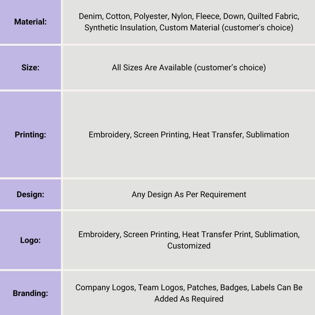 | Material | Denim, Cotton, Polyester, Nylon, Fleece, Down, Quilted Fabric, Synthetic Insulation, Custom Material (customer’s choice) |